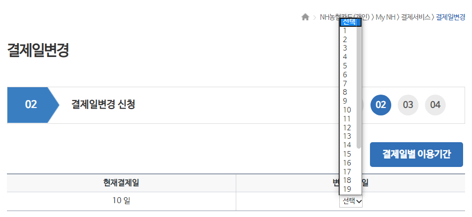 1단계에서 현재 결제일을 확인 후 2단계로 넘어가서 우측의 "변경결제일"을 연 뒤 1일~27일 중에서 원하는 날짜로 변경합니다.