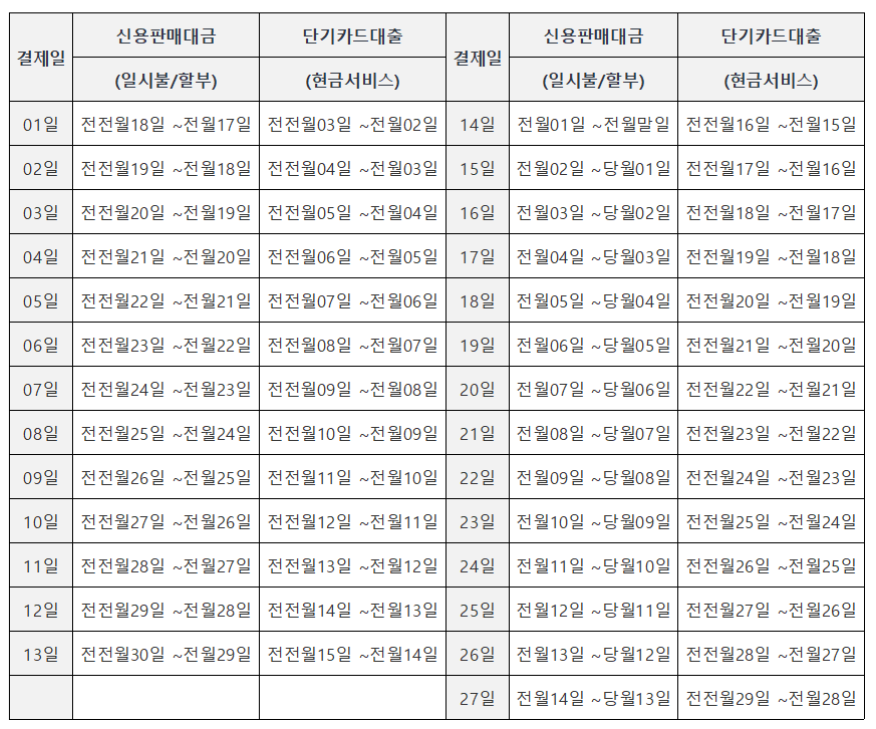 예를 들어 결제일이 1일인 경우에는 이용기간이 전전월 18일~전월 17일이며, 결제일이 27일인 경우에는 전월 14일~당월 13일입니다.