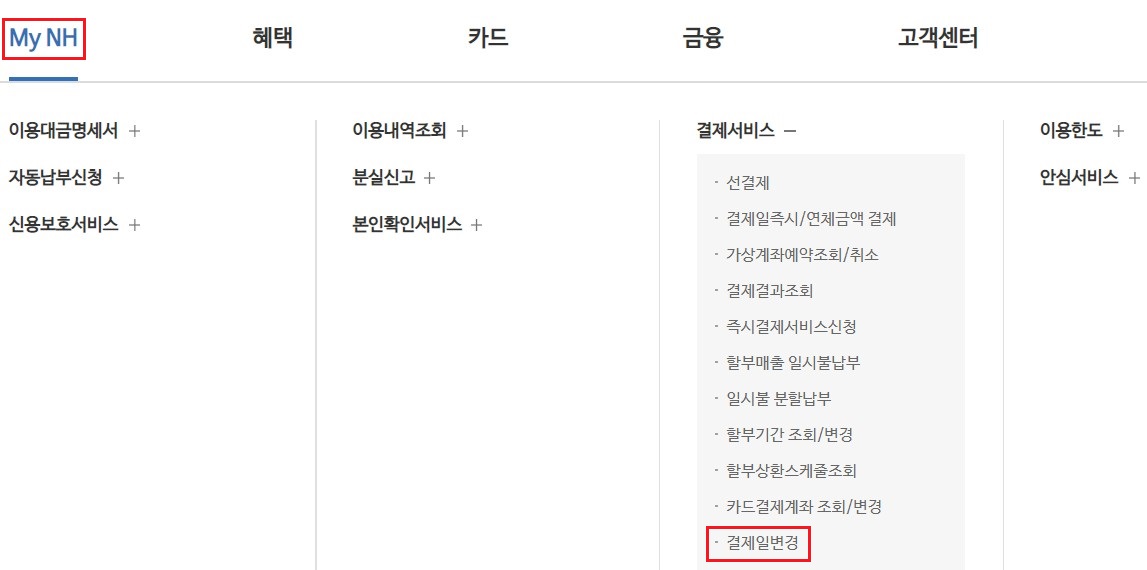 NH농협카드 홈페이지에 접속한 뒤 상단 항목 중 "My NH - 결제서비스 - 결제일 변경" 으로 들어갑니다.