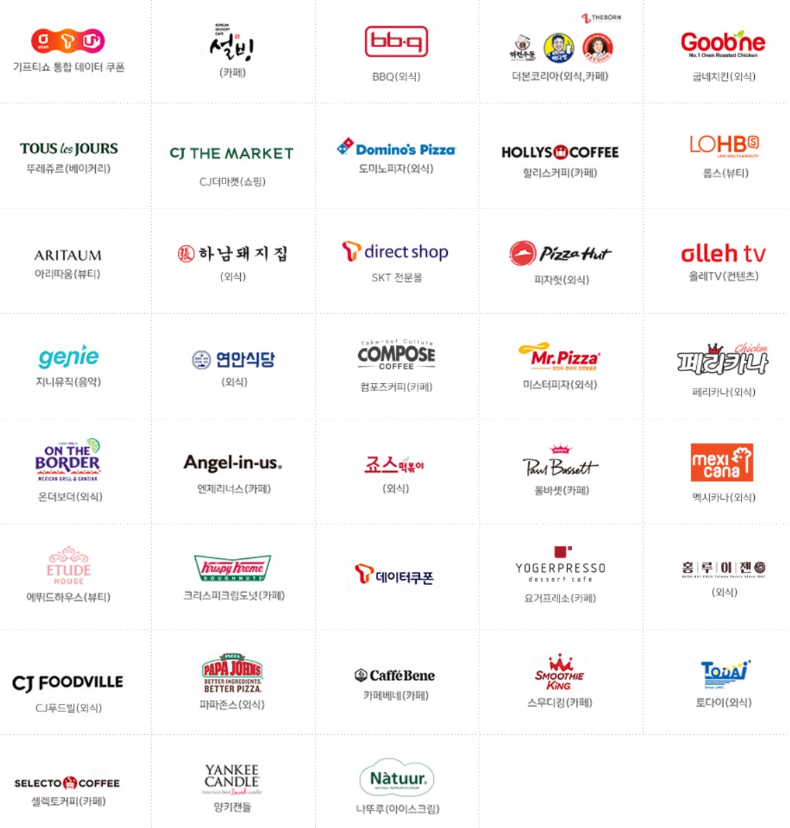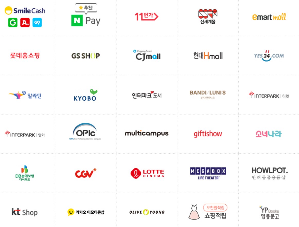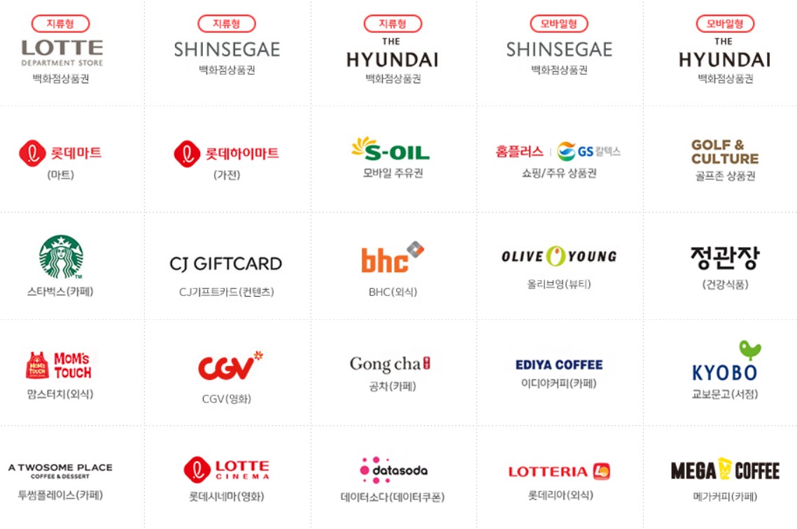 백화점(롯데, 신세계, 현대), 마트(롯데마트, 롯데하이마트, 홈플러스 등), 주유권(에스오일, 지에스칼텍스), 카페(스타벅스, 공차, 이디야, 투썸플레이스, 메가커피, 설빙, 빽다방, 할리스, 스무디킹, 홍루이젠, 요거프레소, 카페베네 등), 영화/도서(롯데, CGV,교보문고), 외식(bhc, bbq, 굽네, 페리카나, 멕시카나, 죠스떡볶이, 도미노피자, 피자헛, 미스터피자, 연안식당, 파파존스 등), 뷰티(올리브영, 에뛰드하우스, 롭스, 아리따움 등), 컨텐츠(지니뮤직, 올레tv 등) 등으로 온라인 사용처보다 보다 많은 곳에서 사용하실 수 있습니다.