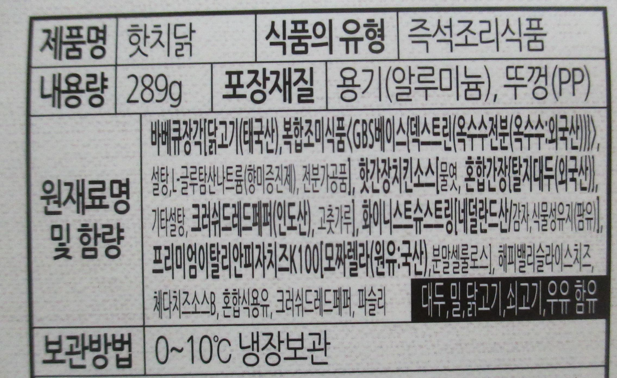편스토랑 류수영 핫치닭(치치닭)은 1인분 제품으로 289g에 692kcal이며, 가격은 4,900원이에요. 1월 2일부터 10일까지만 증정품으로 펩시 콜라를 주었는데, 운좋게 증정 행사 기간에 구입을 했어요.
