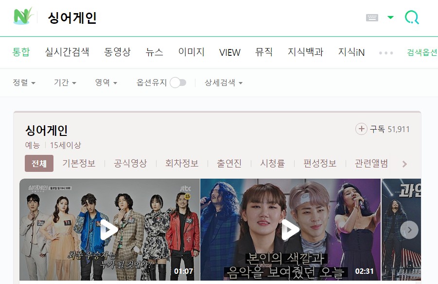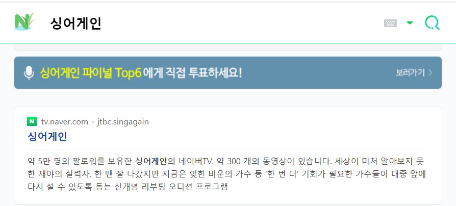 1. 네이버 검색창에서 '싱어게인'을 입력합니다.