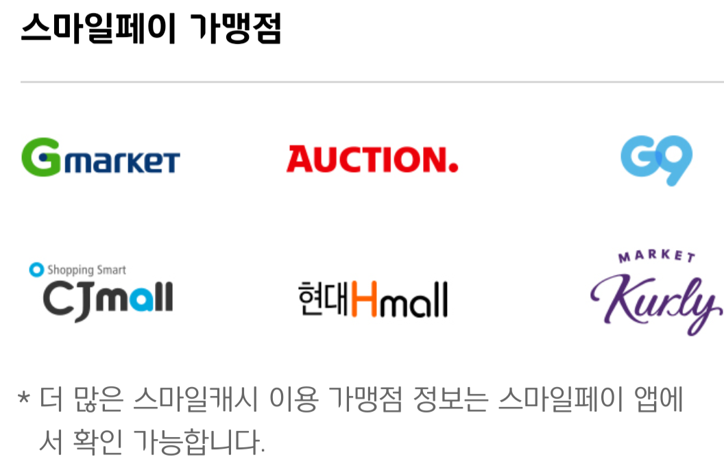 스마일페이 가맹점은 지마켓, 옥션. 지구 외에도 굉장히 많아요.