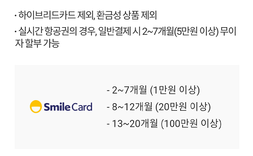 스마일카드만의 차별화된 혜택중 가장 좋다고 여겼던 건 1만원 이상부터 할부가 가능하는 점이에요. 되도록이면 할부는 이용하지 않으려고 애쓰고 있지만, 1만원 이상부터 할부가 가능하다니깐 괜히 든든하더라구요.