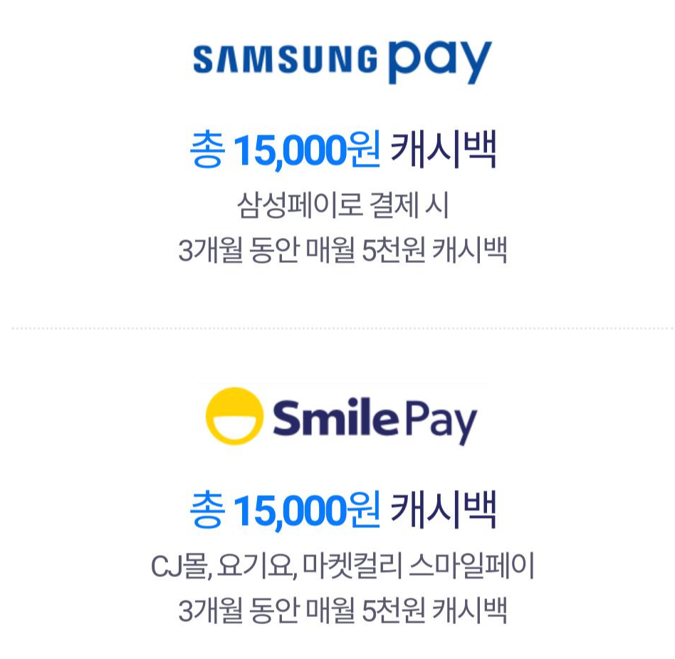 총 3만의 캐시백도 받으실 수 있어요. 삼성페이가 있으시다면 삼성페이로 결제 시 3개월 동안 매월 5천원 캐시백(총 15,000원)을 받으실 수 있고, CJ몰, 요기요, 마켓컬리에서 스마일페이를 이용하면 또 3개월 동안 매월 5천원 캐시백(총 15,000원)을 받으실 수 있답니다.