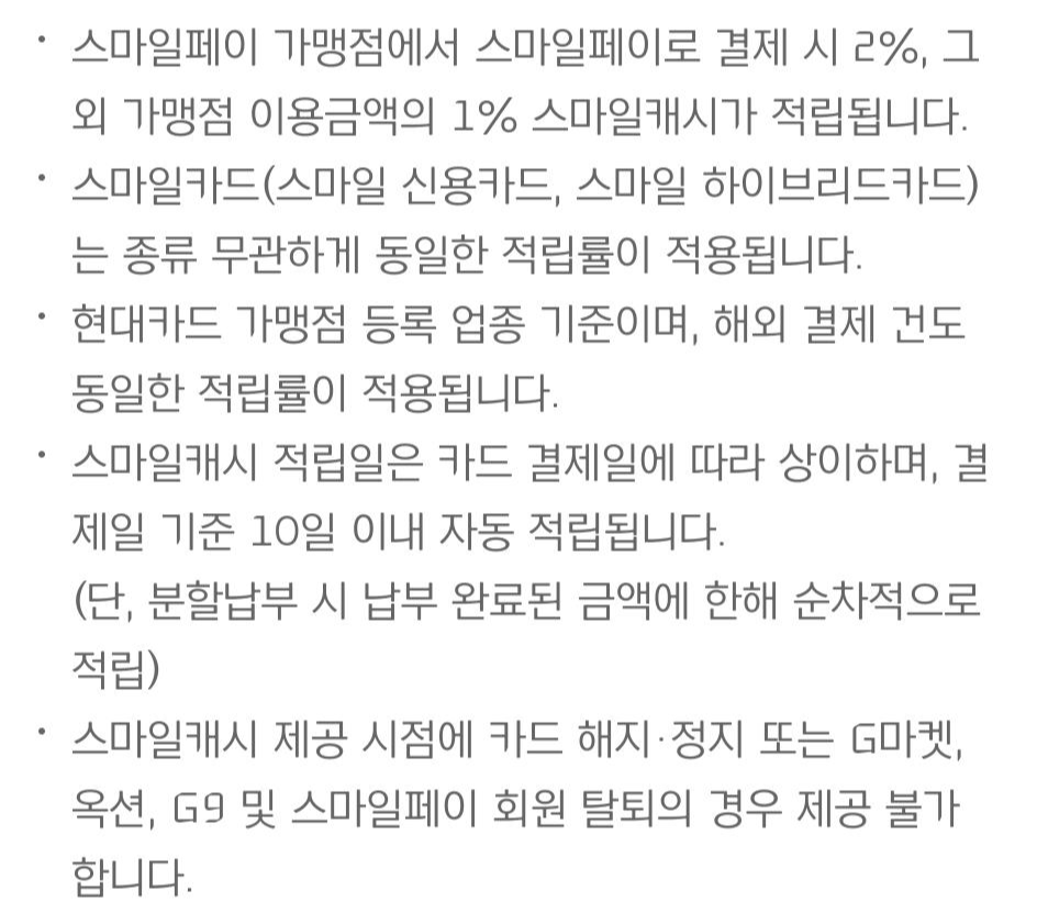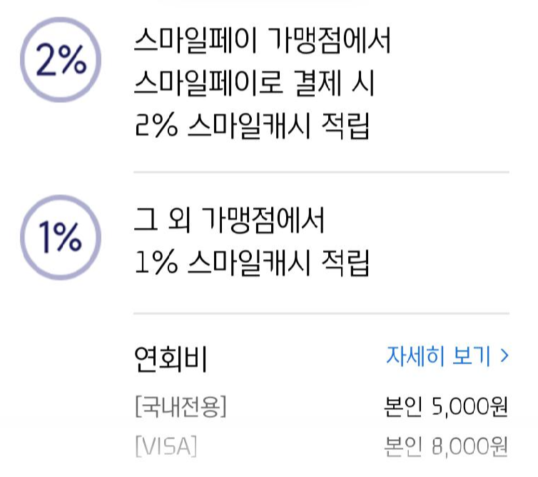 스마일카드 연회비는 국내전용은 5,000원이고, 국내외겸용(VISA)은 10,000원입니다. 저는 국내 전용으로 만들었고, 신규 혜택만으로도 올해 연회비는 뽑고도 남았네요. 소소하지만 매달 스마일캐시도 적립받고 있고, 지마켓, 지구, 옥션에서 쇼핑 시 이따금씩 현대카드 할인 혜택도 받고 있고, 현재는 만족하며 사용하고 있습니다.