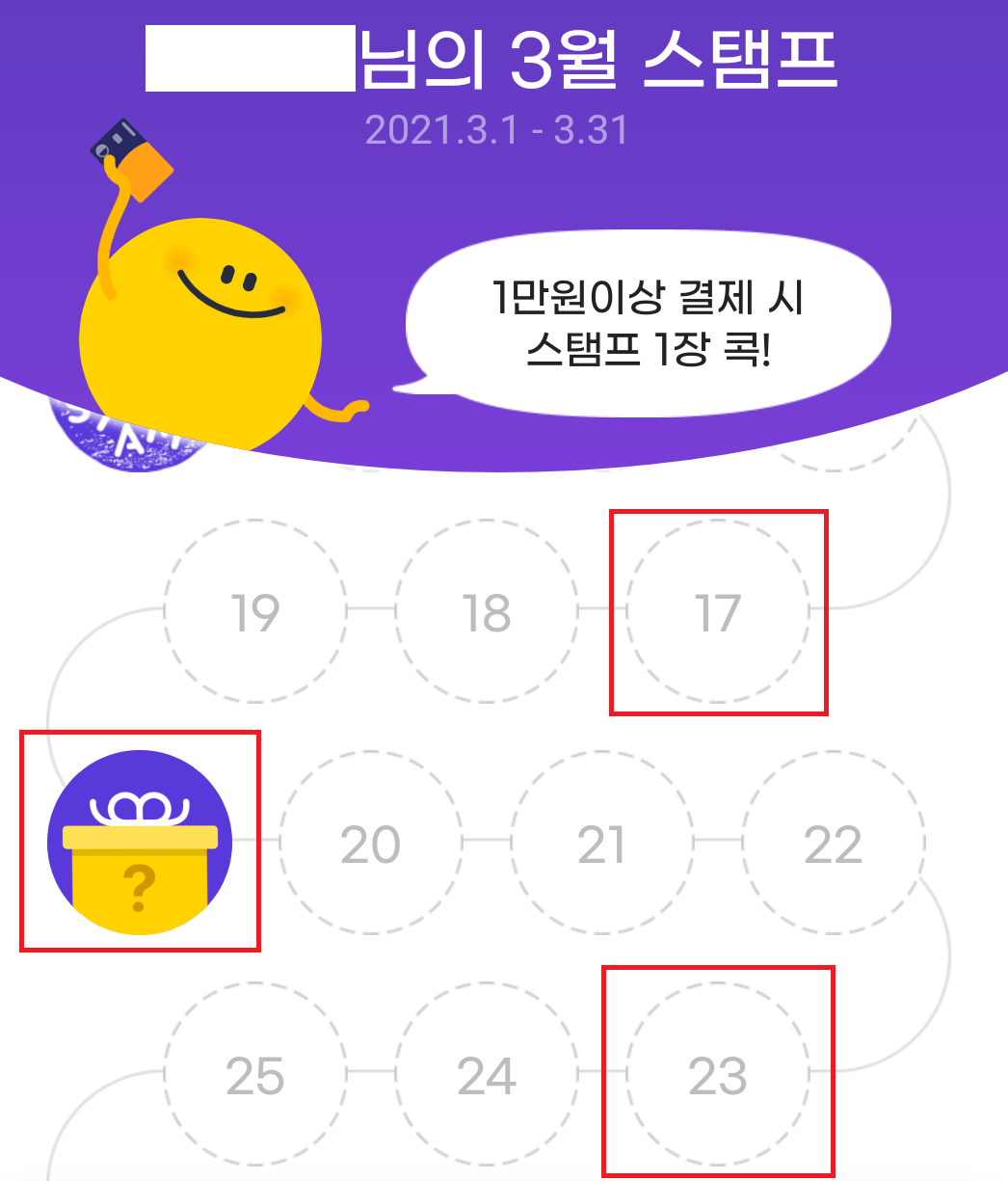 6~7번째 마다 선물 상자를 열 수 있는데, 꼭 1만원 이상 결제를 해야만 스탬프를 받을 수 있는 건 아니고 중간중간 그냥 스탬프 1개를 더 찍어주거나 간단한 미션 수행 후 스탬프를 찍어줍니다.