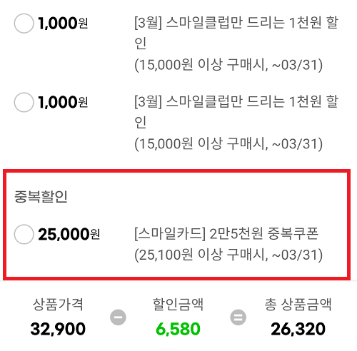 세 번째! 지마켓에서 25,100원 이상 구매 시 25,000원 중복쿠폰도 받으실 수 있어요. 제가 가입했을 땐 3만원이었는데, 5천원 내렸네요.