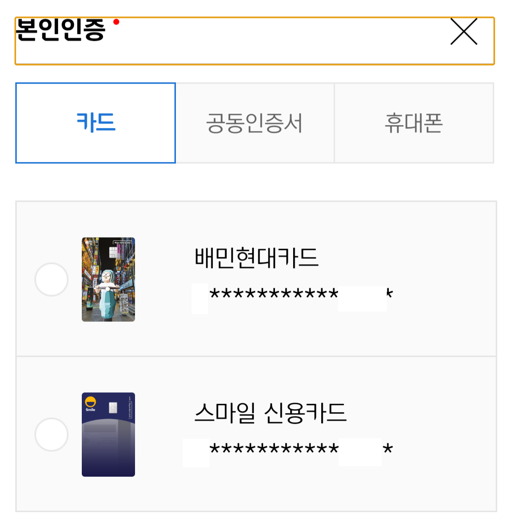 5. 마지막으로 카드, 공인인증서, 휴대폰 세 가지 중 하나로 본인인증을 하시면 선결제가 완료됩니다. 참고로 셋 중에서 카드로 본인인증을 하는 방법이 가장 간단합니다.