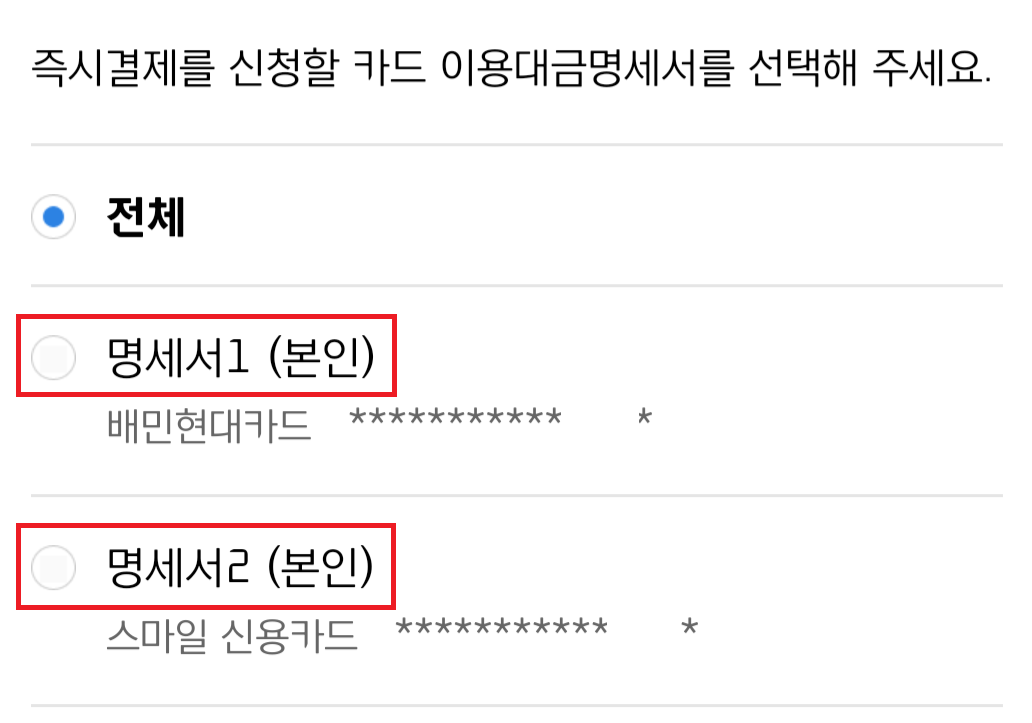 3. 선결제를 진행할 카드를 선택합니다. 이때 현대카드를 여러 개 보유하고 있을 경우 카드별로 선결제를 진행할 수도 있습니다.