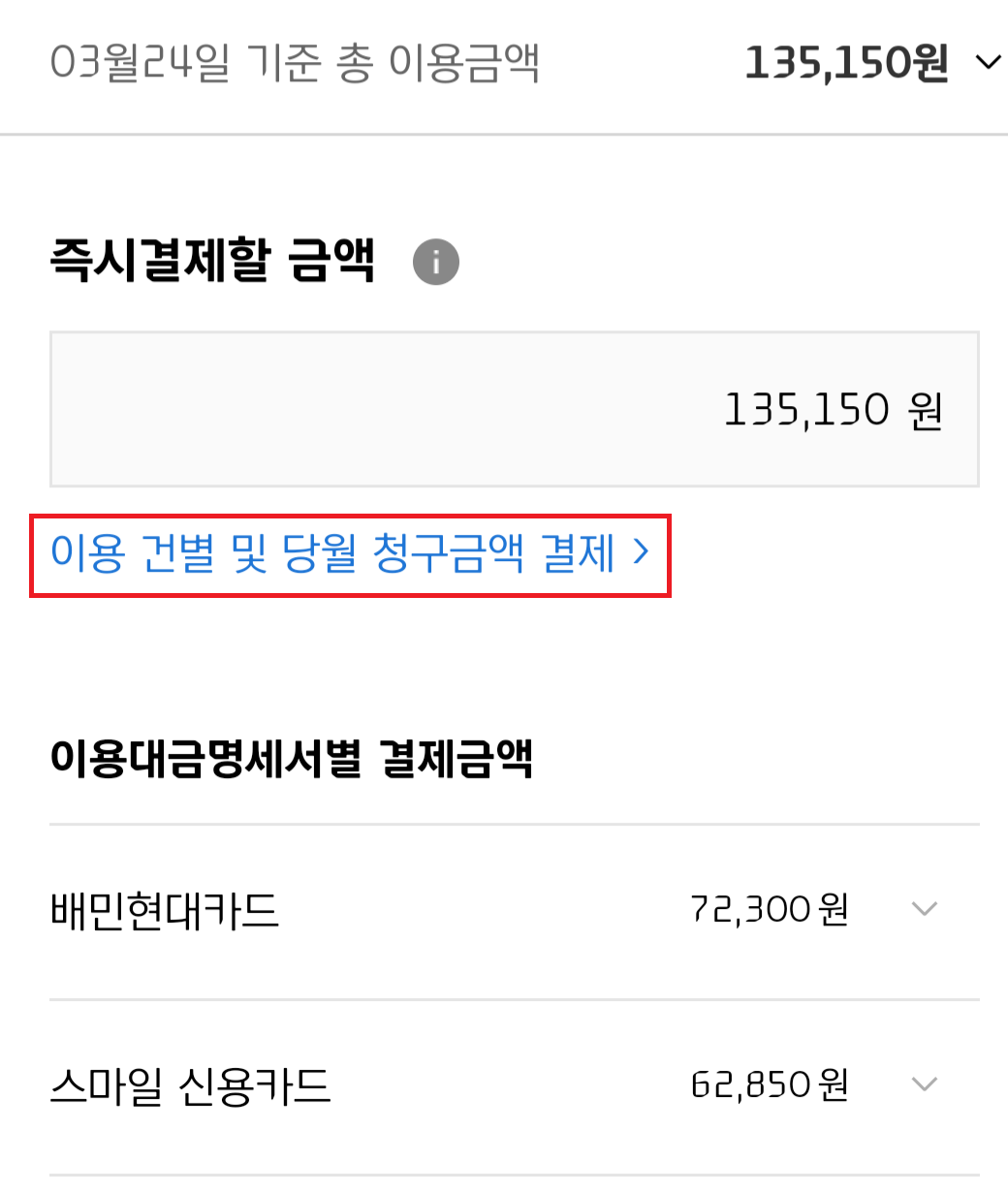 여기서 즉시결제할 금액 밑의 '이용 건별 및 당월 청구금액 결제'를 클릭하면 건별 결제를 진행할 수 있습니다. 이에 대한 설명은 아래에서 다시 드리겠습니다.