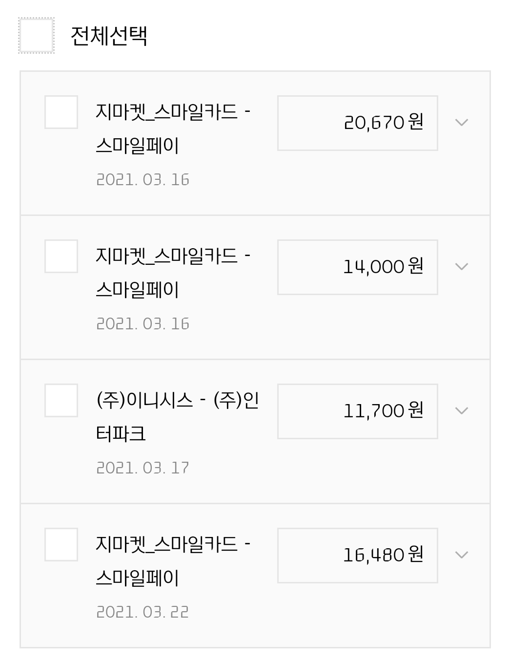 건별 이용금액이 뜨면 선결제를 하고자하는 건만 체크한 다음 선결제를 마저 진행합니다.