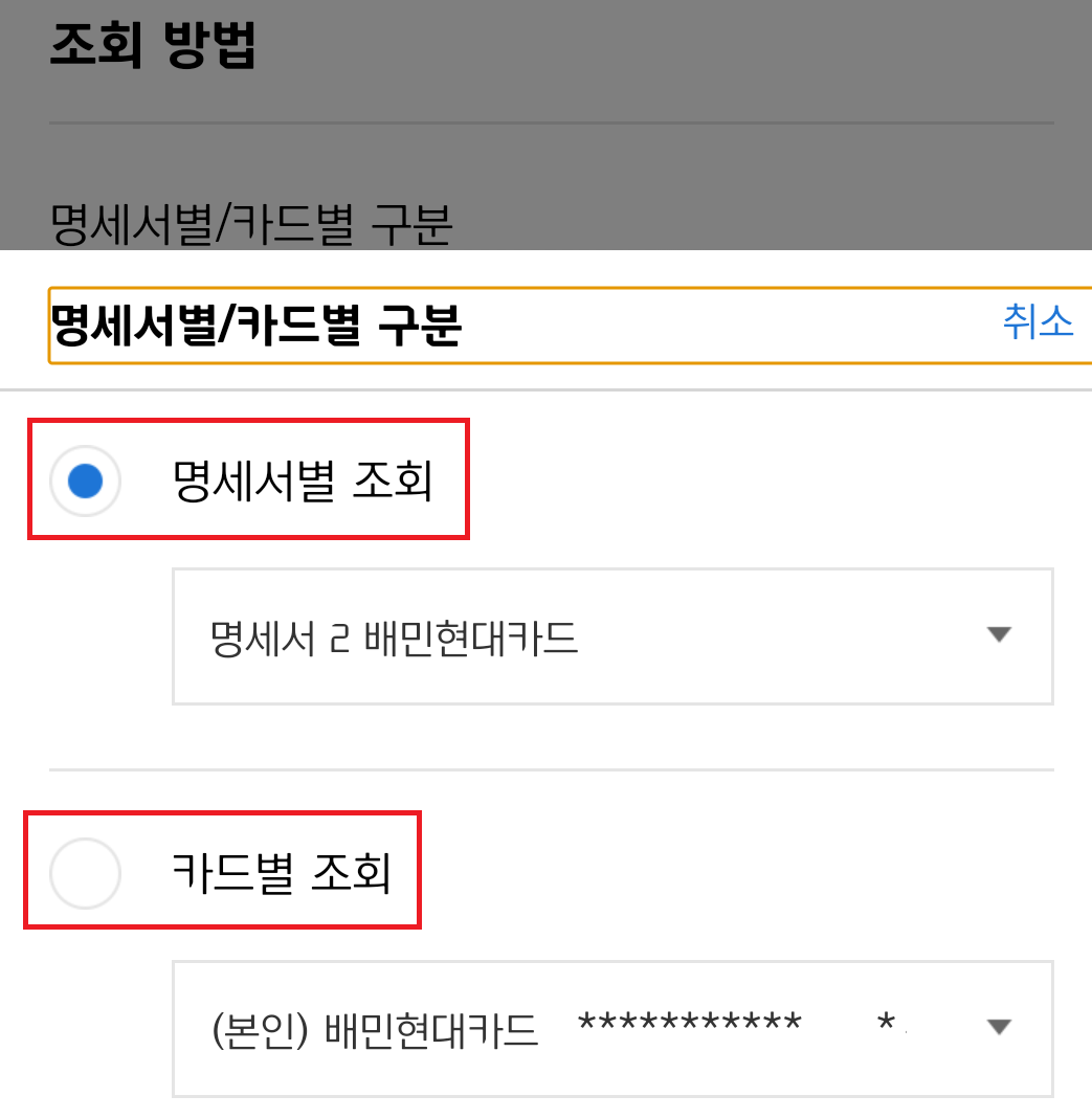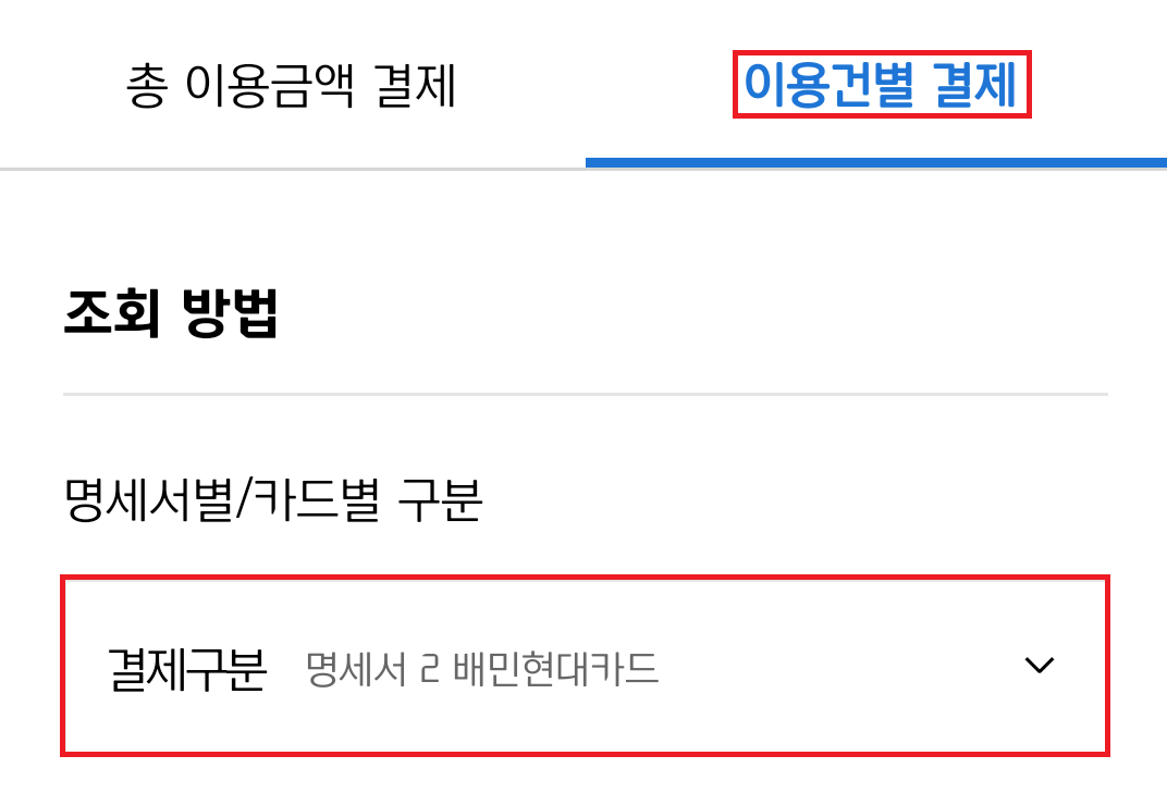 명세서별 조회는 다음 결제일에 납부해야할 대금만을 포함하며, 카드별 조회는 선결제를 진행하는 시점까지 사용한 금액을 모두 표시합니다.