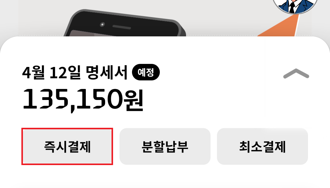 1. 앱 하단의 명세서 아래 '즉시결제'를 선택합니다.