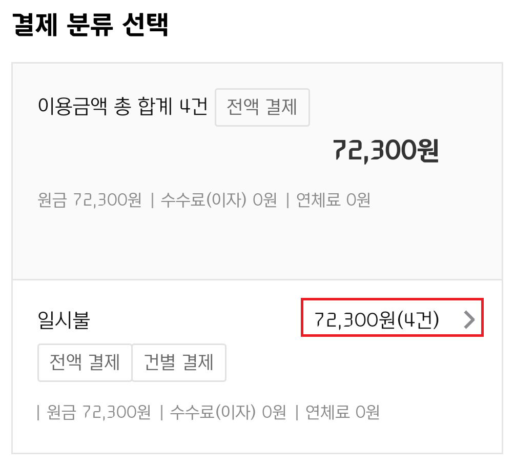 카드가 여러 개일 경우에는 선결제를 진행할 카드를 선택하고, 결제 분류 선택에서 카드 이용금액 옆의 ' > '를 클릭합니다.