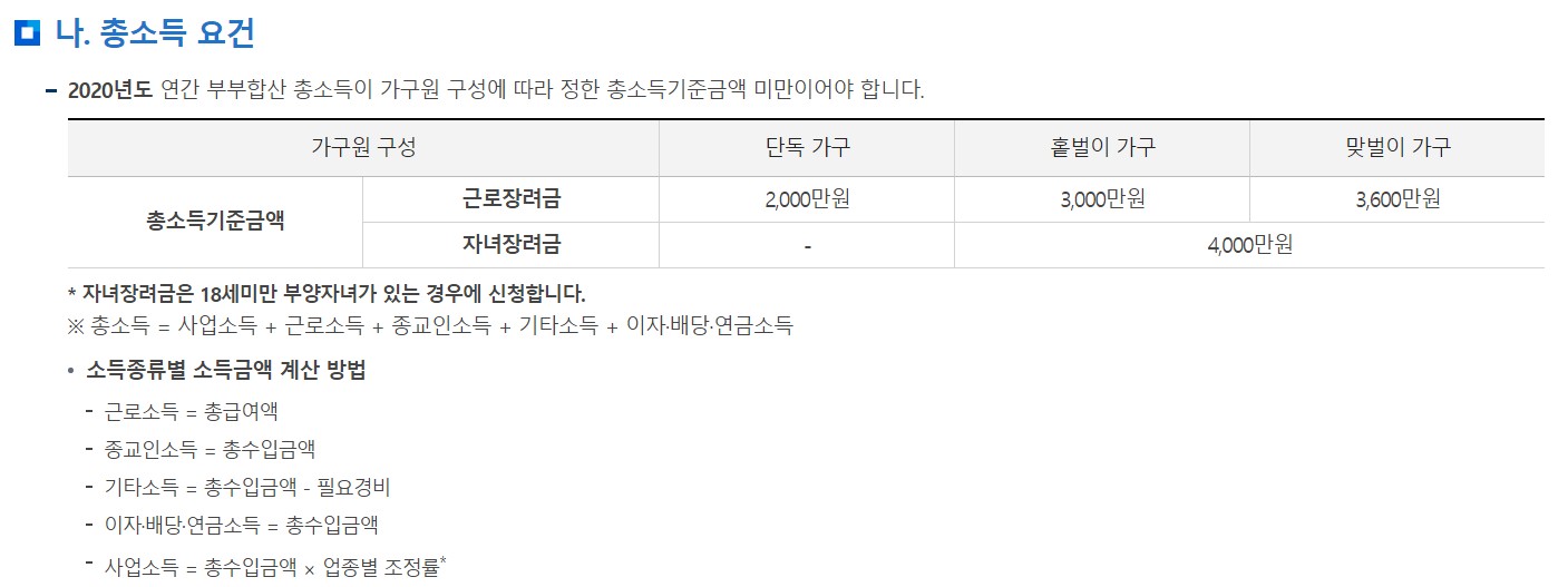 자녀장려금의 총소득 요건은 근로장려금과 달리 가구원 구성(홑벌이가구, 맞벌이가구)에 상관없이 전년도 총소득기준금액이 4,000만원 미만이면 신청 가능합니다.