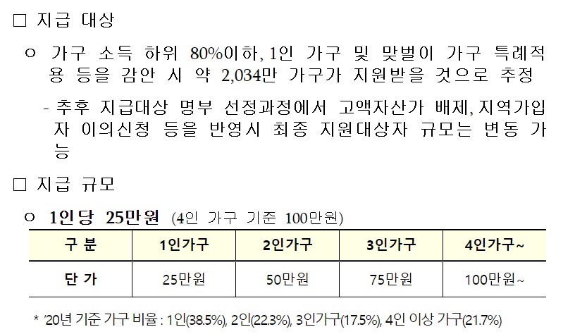 처음에 소득 하위 80%이하에 지급키로 했던 안과 확정된 안의 기본 선정 기준이 소득 하위 80%이하 지급인 건 같지만, 1인 가구와 맞벌이 가구에 특례를 적용하여 실질적으로는 소득 하위 약 87~88%이하면 받을 수 있게 되었습니다.
