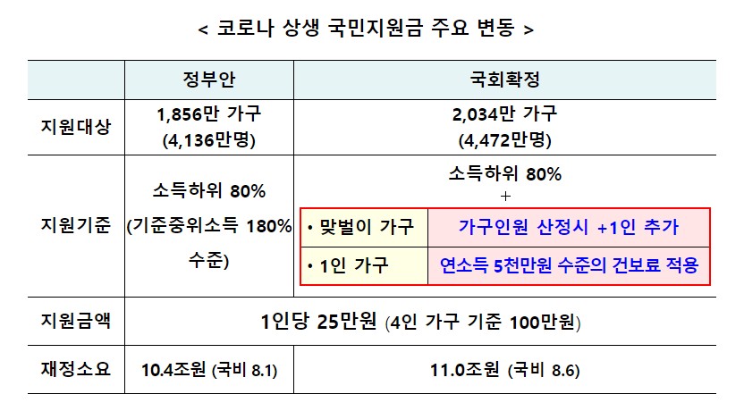 소득하위 80%이하에 지급키로 했던 처음의 안과 달리 지원 대상과 재정이 얼마나 늘었고, 지원 기준이 어떻게 달라졌는지 위 표에 간략히 요약되어 있으므로 참고하세요.