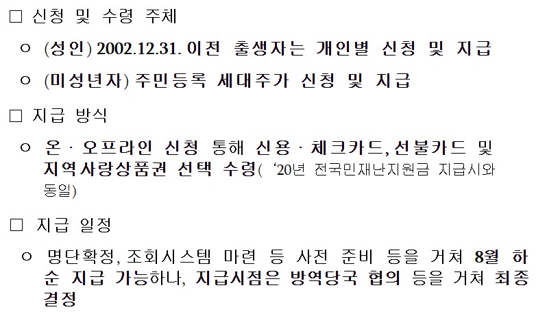 지급 방식은 온/오프라인 신청을 통해서 신용ㆍ체크카드, 선불카드 및 지역사랑상품권 중 하나를 선택하여 수령하시게 되며, 지급 일정은 8원 하순 지급으로 예상되나 방역당국 협의 등을 거쳐야 최종 결정이 납니다.