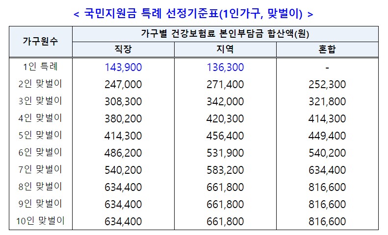 1인 가구 역시 특례가 적용되어 기본 선정기준표에 나오는 금액이 아니라 직장가입자는 143,900원, 지역가입자는 136,300원 이하면 국민지원금 대상에 포함됩니다.
