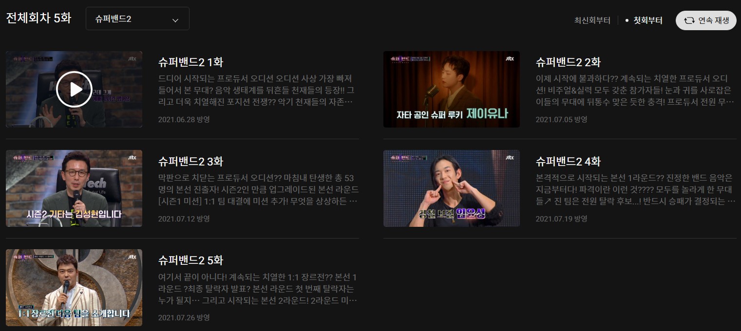 슈퍼밴드2 재방송도 실시간으로도 시청이 어려우시다면 다시보기로 보실 수도 있어요.