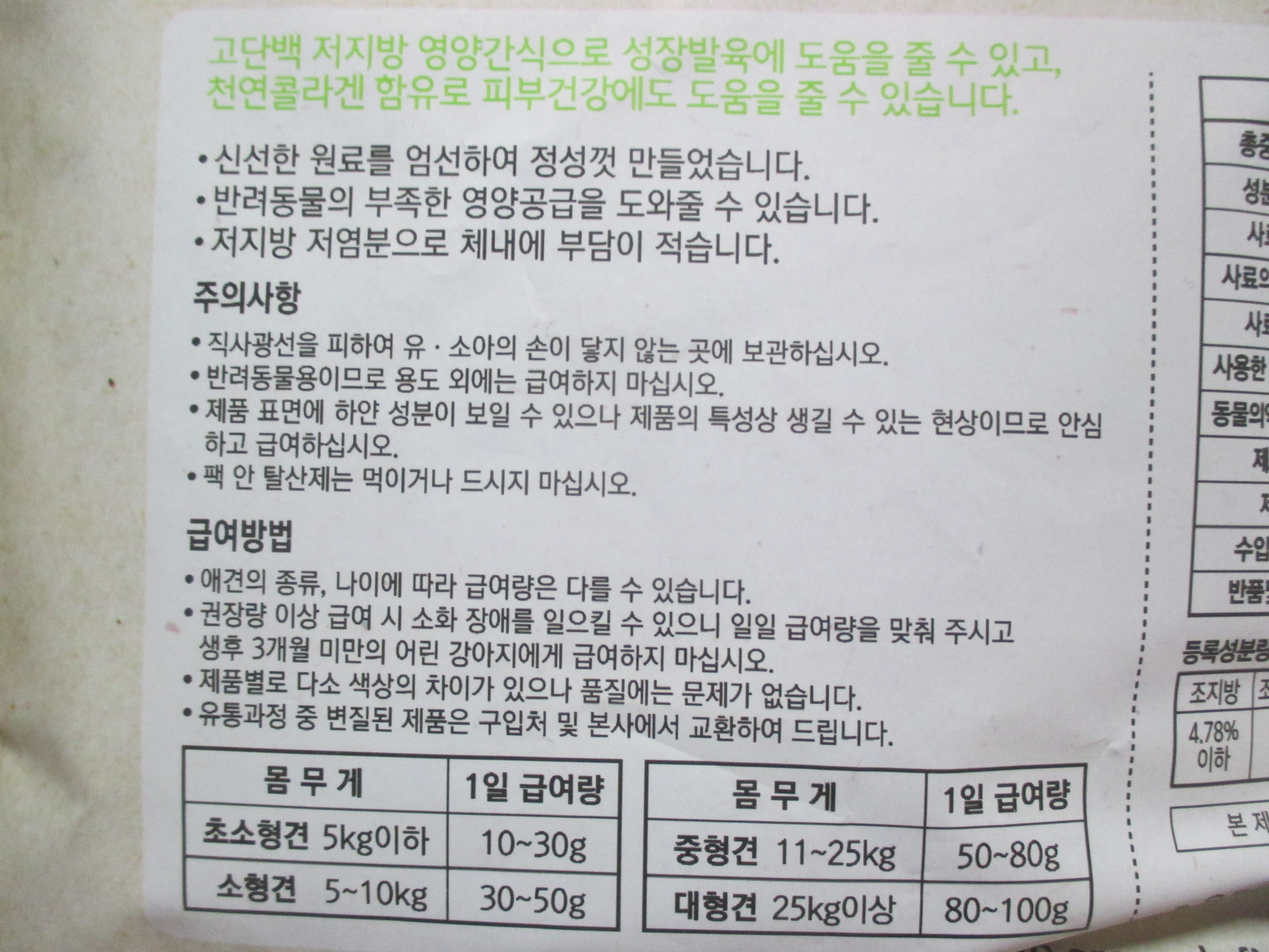 얼만큼 줘야하는지 강아지의 몸무게(체격)에 따른 1일 급여량도 친절하게 나와있어요.