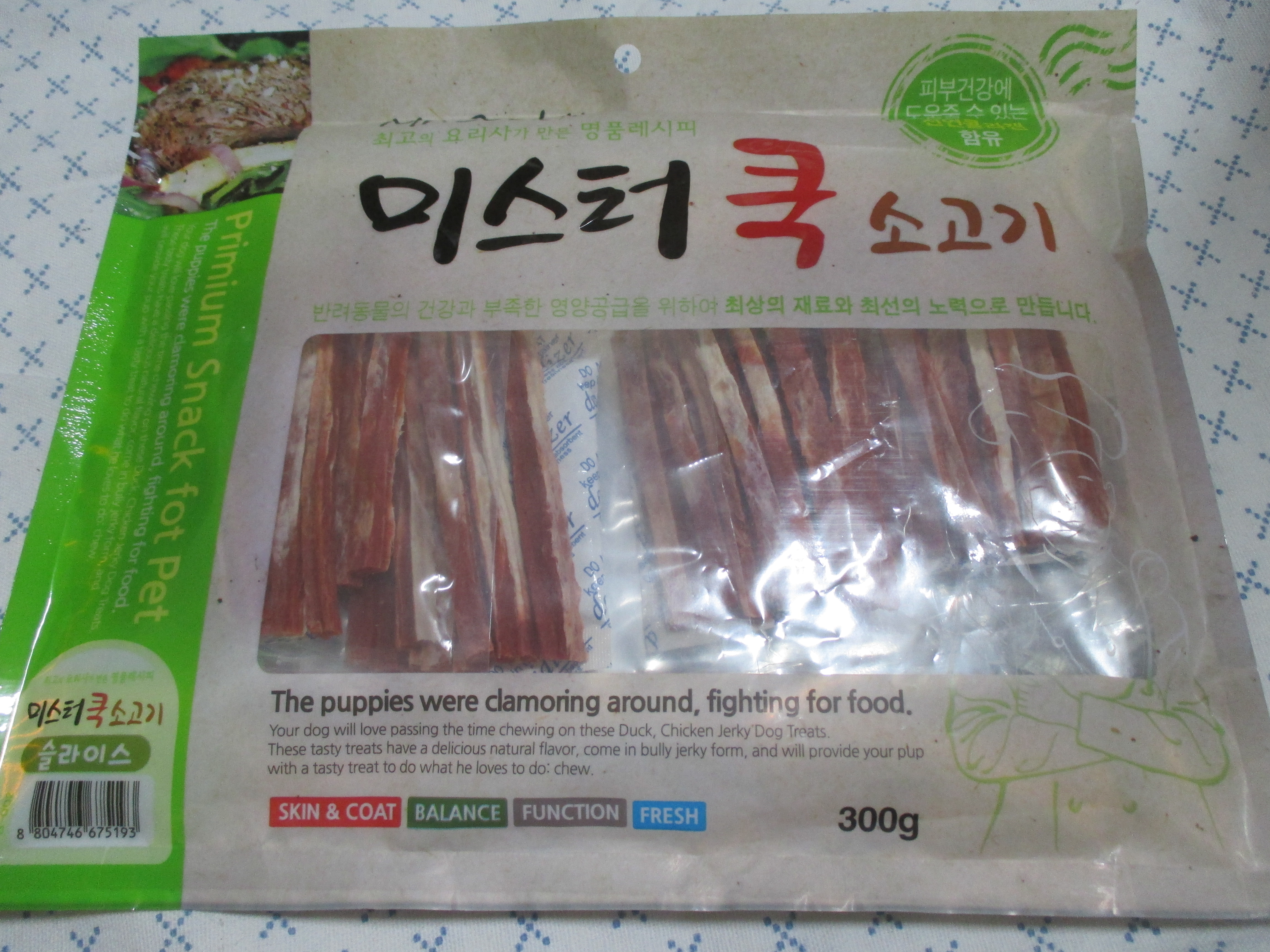 제품명은 '미스터쿡 소고기'로 구입처는 지마켓 스마일배송이고요, 강아지 치석제거 껌 살 때 함께 샀어요. 중량은 300g이고, 가격은 2,400원으로 중량 대비 저렴한 편이에요.