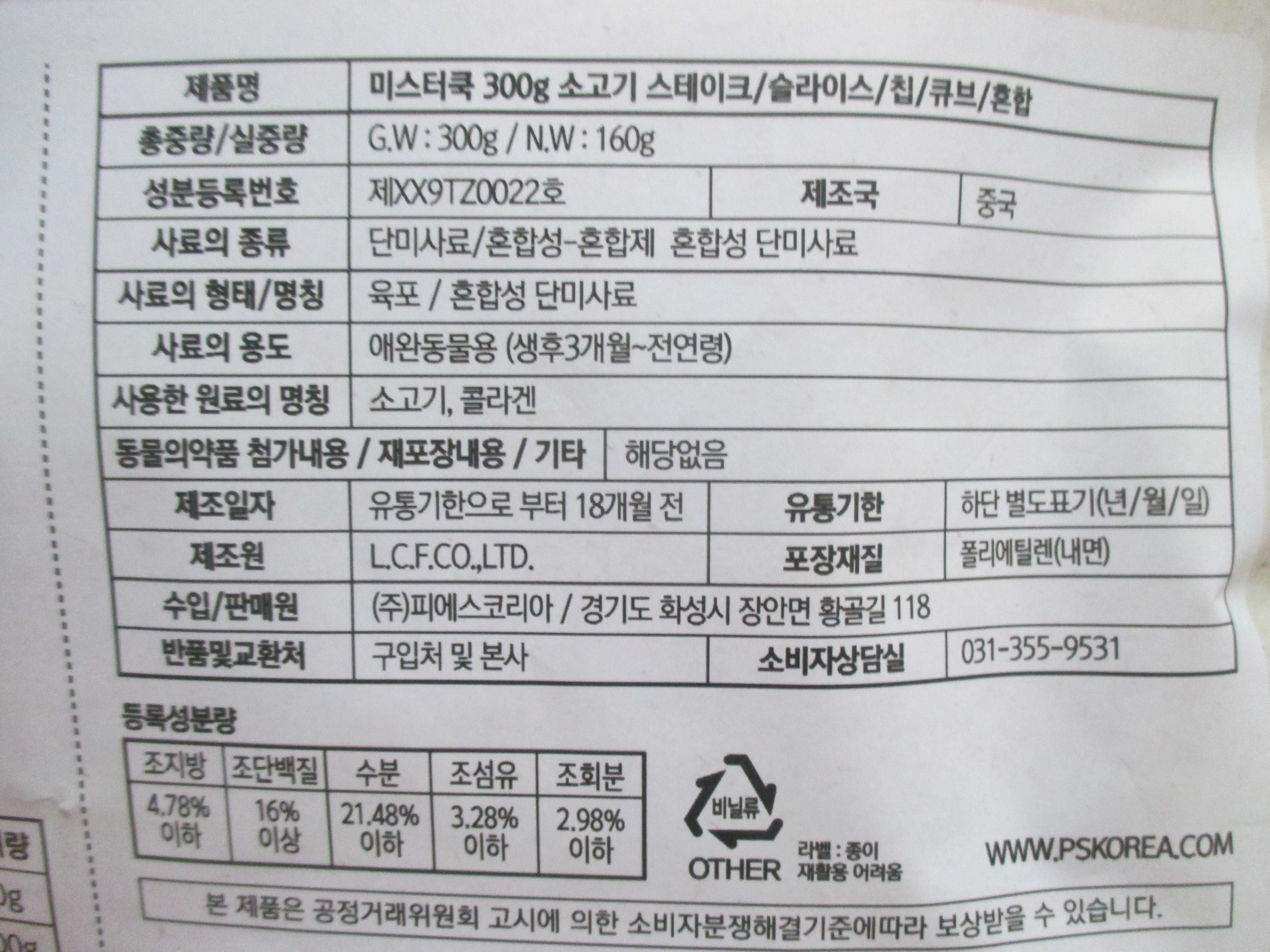 조지방은 4.78%이하, 조단백질은 16%이상, 수분은 21.48%이하, 조섬유는 3.28%이하, 조회분은 2.98%이하라고 적혀 있네요.