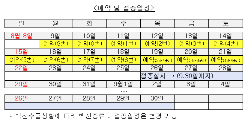 8월 9일부터 18일까지 10부제 사전예약이 끝난 뒤에는 19일부터 21일까지 연령별로 나누어 19일은 36~49세, 20일은 18~35세, 21일은 18~49세 중 미처 예약하지 못한 사람들을 대상으로 예약을 받습니다.