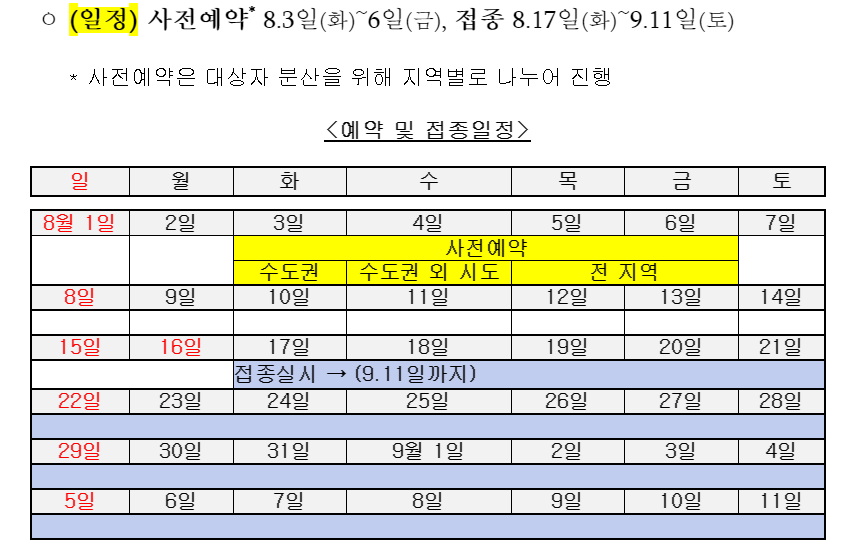 코로나 백신 접종 예약 우선 대상자 분들은 8월 3일부터 6일까지 사전예약을 받아(3일 수도권 / 4일 수도권외 시도 / 5일, 6일 전 지역) 17일부터 백신 접종을 실시하여 9월 11일까지 완료할 계획입니다.