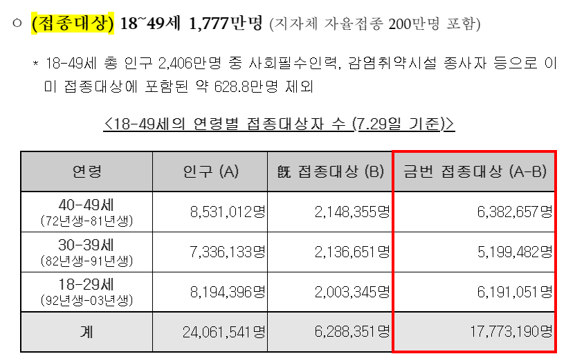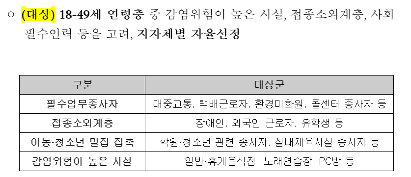 18~49세 중 대중교통, 택배근로자, 환경미화원, 콜센터 종사자, 장애인, 외국인 근로자, 유학생, 학원/청소년 관련 종사자, 실내체육시설 종사자, 일반/휴게음식점, 노래연습장, PC방 종사자등 감염위험이 높은 시설, 접종소외계층, 사회필수인력 등은 코로나 백신 접종 예약 우선 대상자입니다.