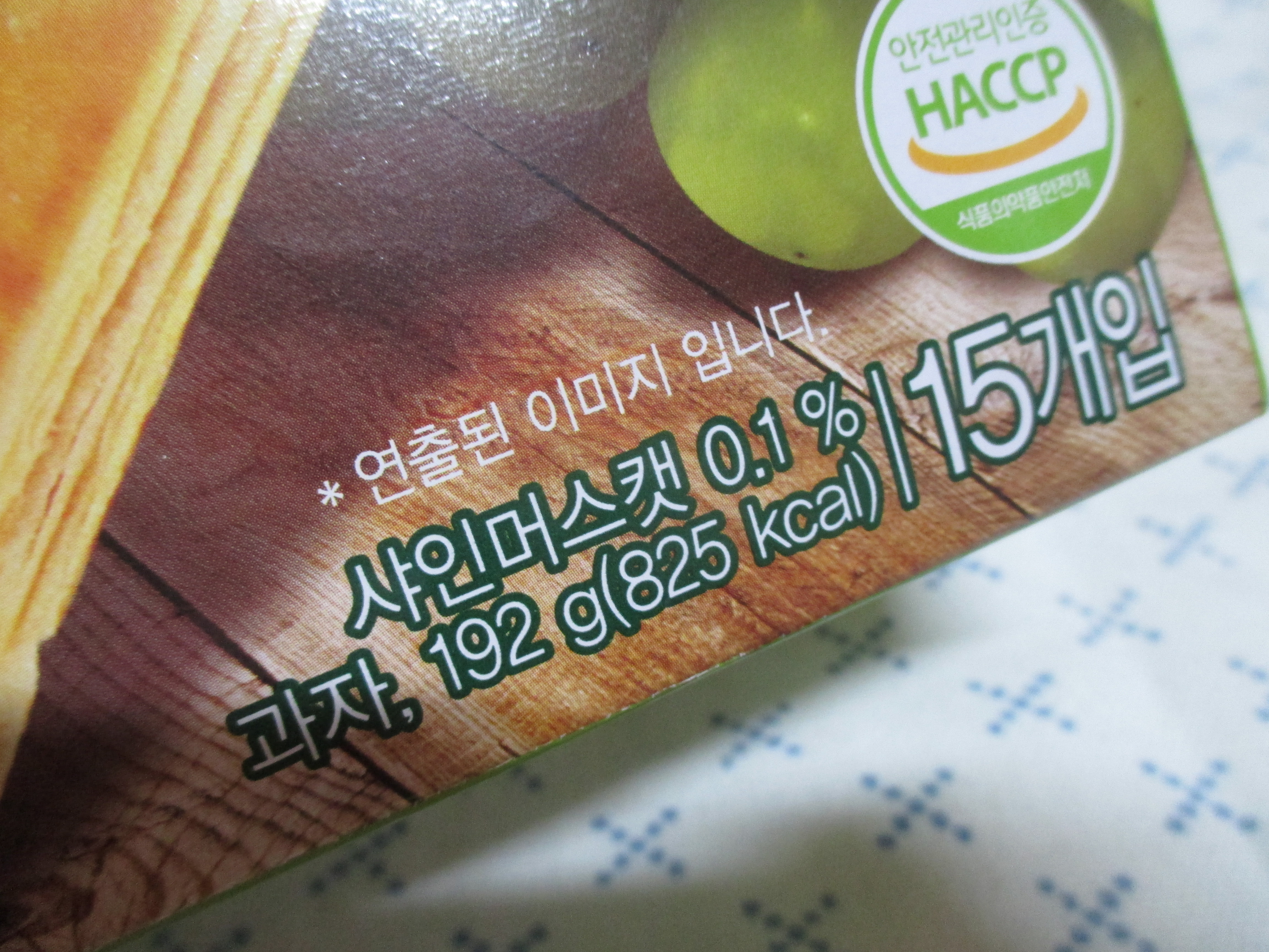 다른 후렌치파이 시리즈와 마찬가지로 한 박스에 15개가 들었고요, 총 중량은 192g이고, 칼로리는 825kcal입니다. 개당 중량과 칼로리를 계산해 보면 13g에 55kcal예요.