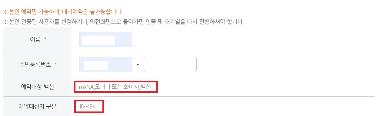 주민등록번호를 입력한 후에는 '대상자 확인' 버튼을 클릭합니다. 예약 대상자가 맞으면 공란이었던 예약대상 백신과 예약대상자 구분란이 자동으로 채워집니다.