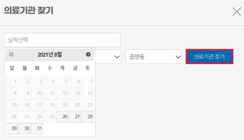 예약 정보 입력과 대상자 확인을 마친 다음에는 하단의 '의료기관 찾기' 버튼을 클릭합니다.