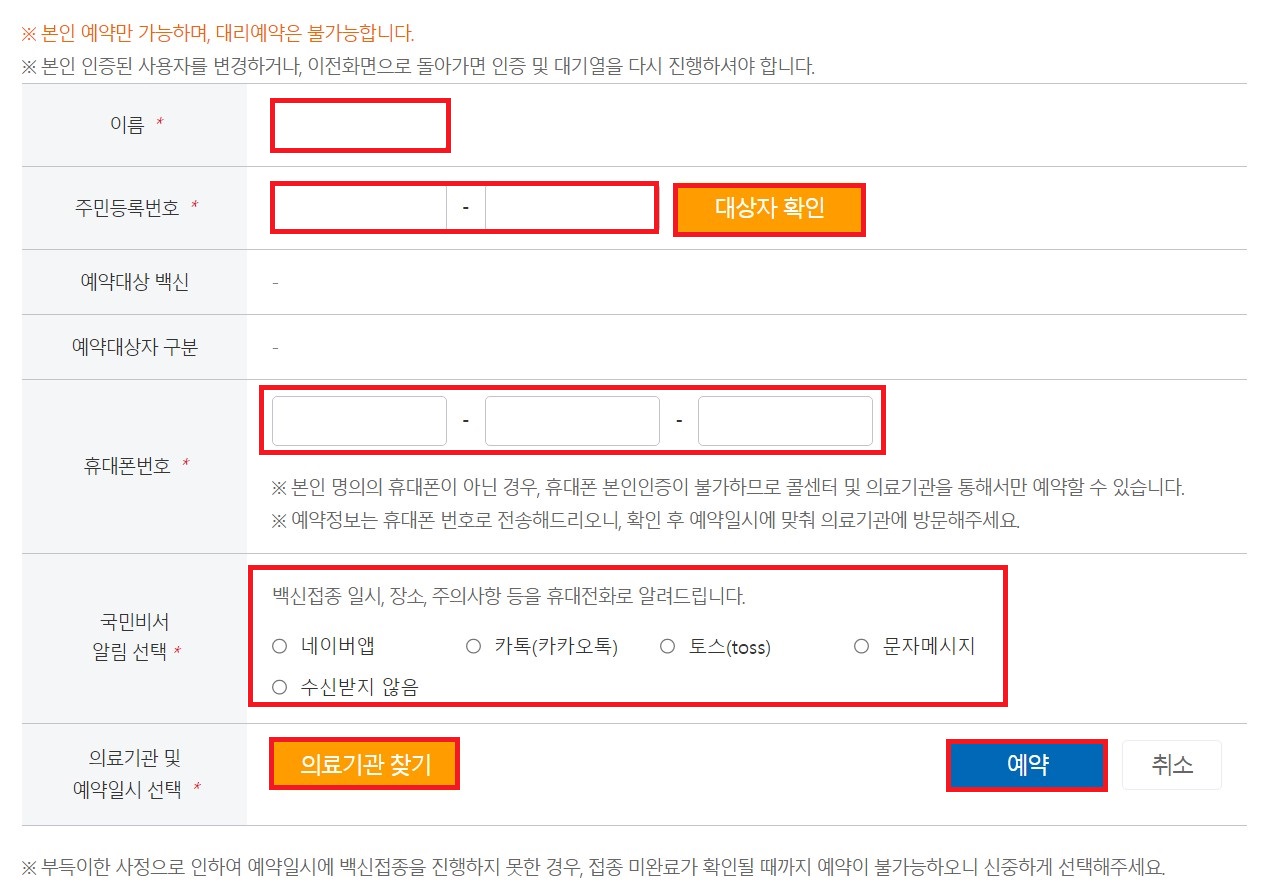 본인 인증을 마치면 예약 정보 입력 단계로 넘어갑니다.