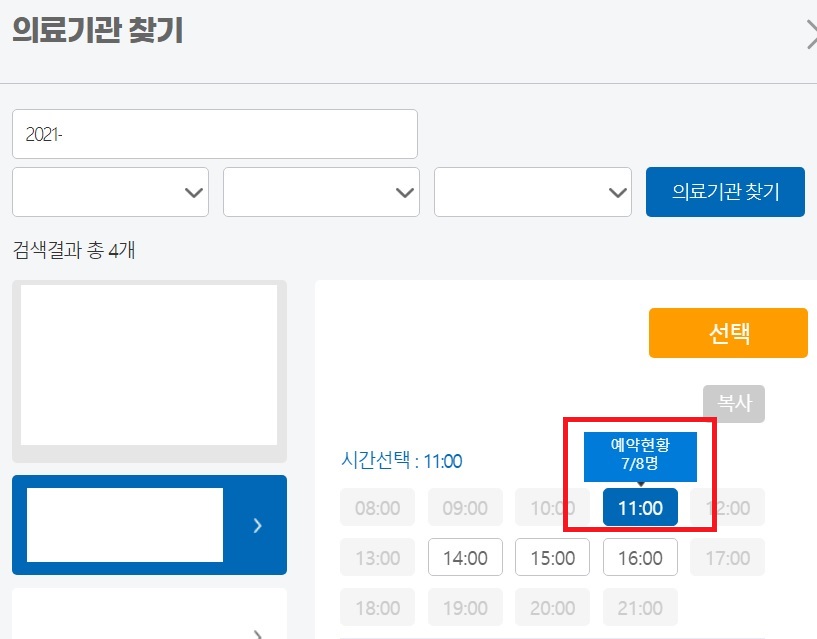 먼저 접종 날짜를 선택하고, 접종받을 지역을 선택하면, 코로나 백신 접종 예약이 가능한 의료기관이 여러 개 뜹니다. 그중 한 곳을 선택한 다음 접종 가능한 시간을 선택합니다. 각 시간을 선택하면 예약 현황을 보실 수 있습니다.