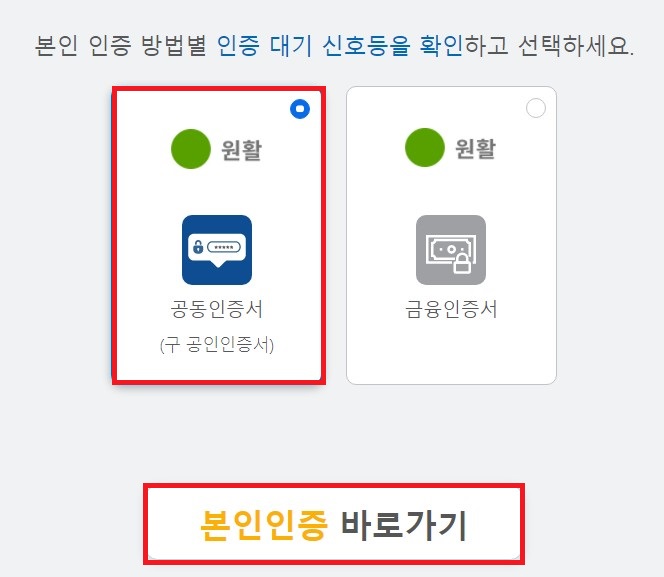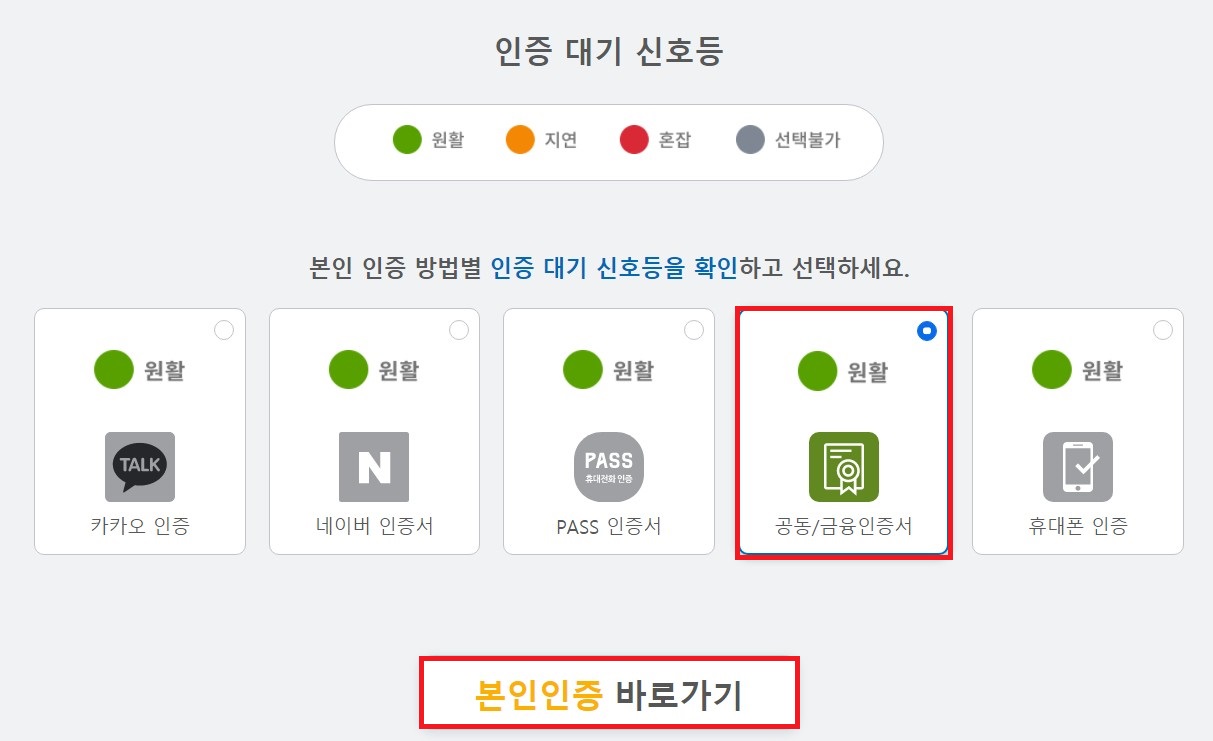 본인 인증 방법은 카카오 인증, 네이버 인증서, PASS 인증서, 공동/금융인증서, 휴대폰 인증 이상 다섯 가지가 있으며, 이중 하나를 선택합니다. 이때 사이트의 현 상황을 알려주는 인증 대기 신호등이 함께 표시됩니다.