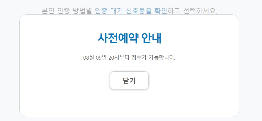 여기서 코로나 백신 접종 예약을 보다 원활히 진행할 수 있는 팁을 알려드리겠습니다. 사전예약이 시작되는 저녁 8시 몇 분전에 미리 사이트에 접속해서 본인 인증 단계까지 진행을 해두는 겁니다. 여기서 예약 가능 시간 전에 '본인 인증 바로가기' 버튼을 누르면 위와 같은 메시지가 나오는데, 이 메시지가 나오는 단계까지 마쳐 놓은 후 저녁 8시가 되자마자 다시 예약을 진행하시면 다음 단계로 수월하게 넘어갈 수 있습니다.