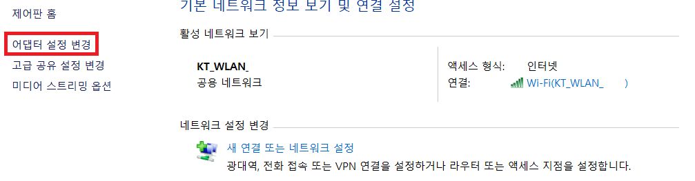 3. 좌측 항목 중 어댑터 설정 변경을 클릭해 주세요.