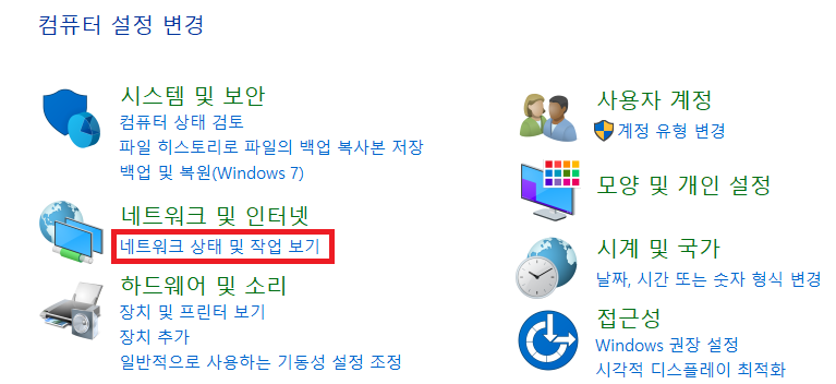 2. 제어판 항목 중 네트워크 및 인터넷 --> 네트워크 상태 및 작업보기를 클릭해 주세요.