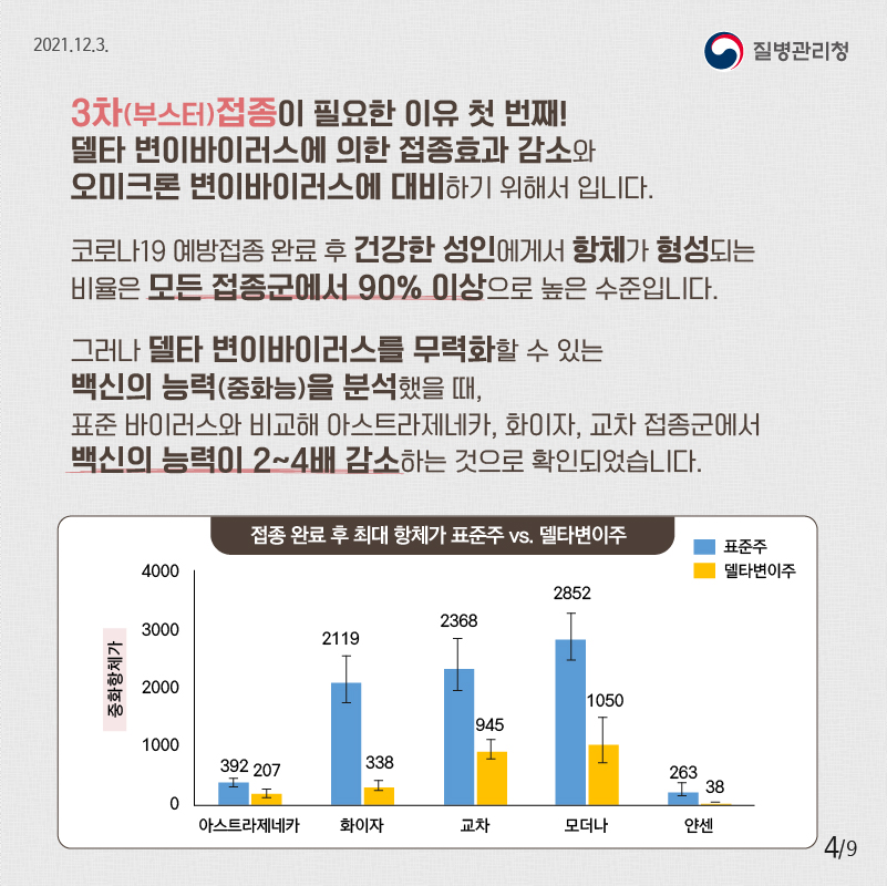 질병관리청에 의하면 델타 변이바이러스에 의한 접종 효과 감소와 오미크론 변이바이러스에 대비하기 위해 필요하다며 접종을 권고하고 있어요.