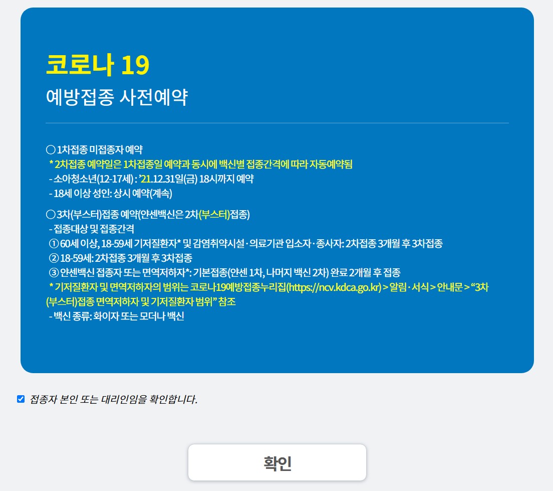 위와 같은 페이지가 뜨면 "접종자 본인 또는 대리인임을 확인합니다"에 체크하시고, "확인" 버튼을 누른 다음 예약 절차를 따르시면 됩니다.