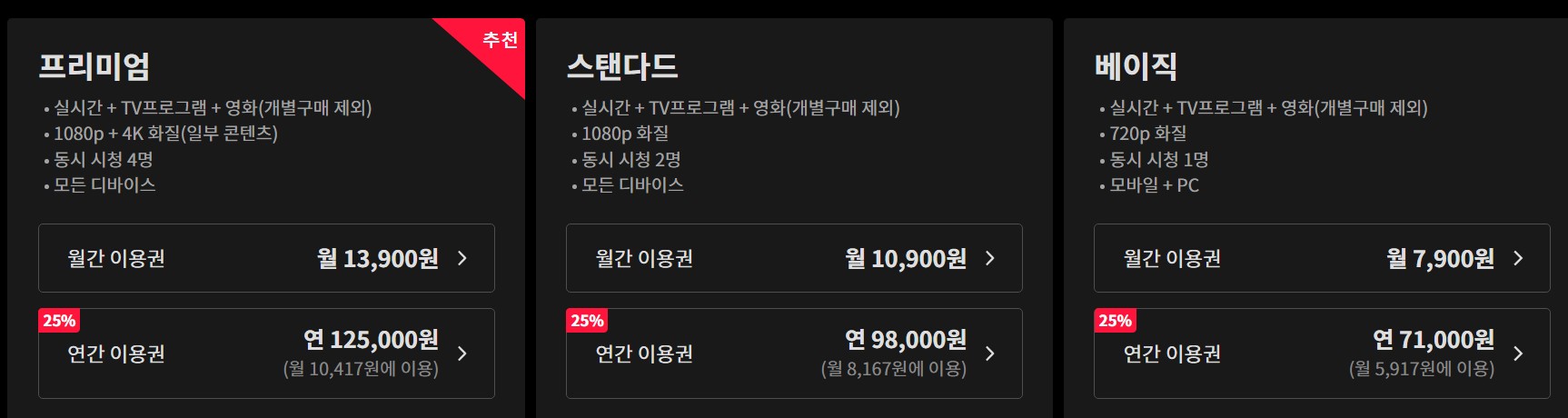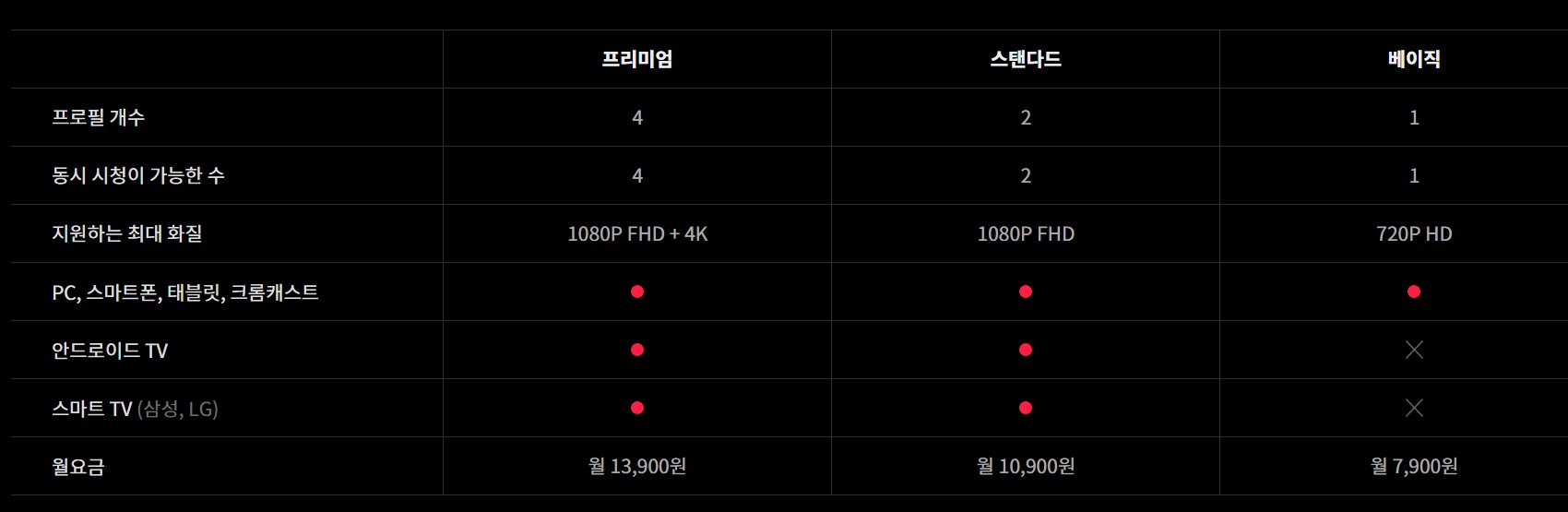 - 티빙 프리미엄 월요금(월 13,900원) / 프로필 개수 4개 / 동시시청 가능 수 4개 / 최대 화질 1080P FHD+4K / 안드로이드, 스마트 TV 가능