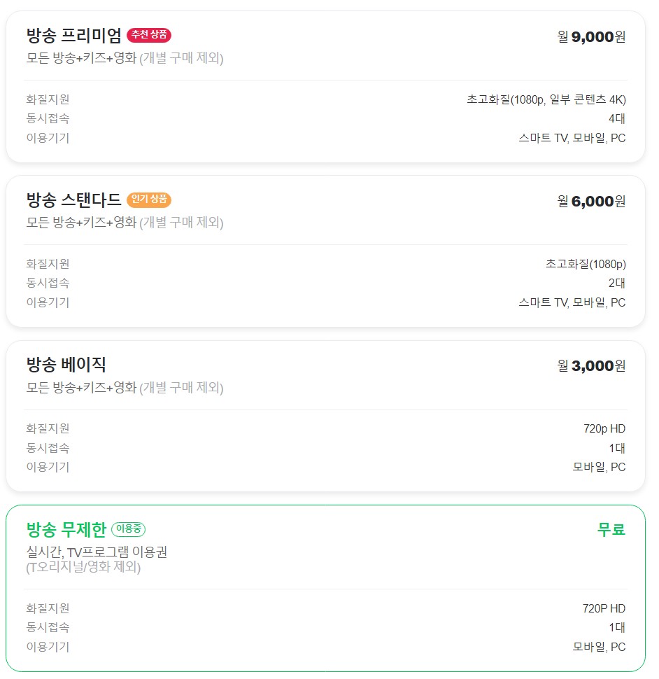 - 티빙 베이직 월요금(월 7,900원) / 프로필 개수 1개 / 동시시청 가능 수 1개 / 최대 화질 720P HD / TV 시청 불가능