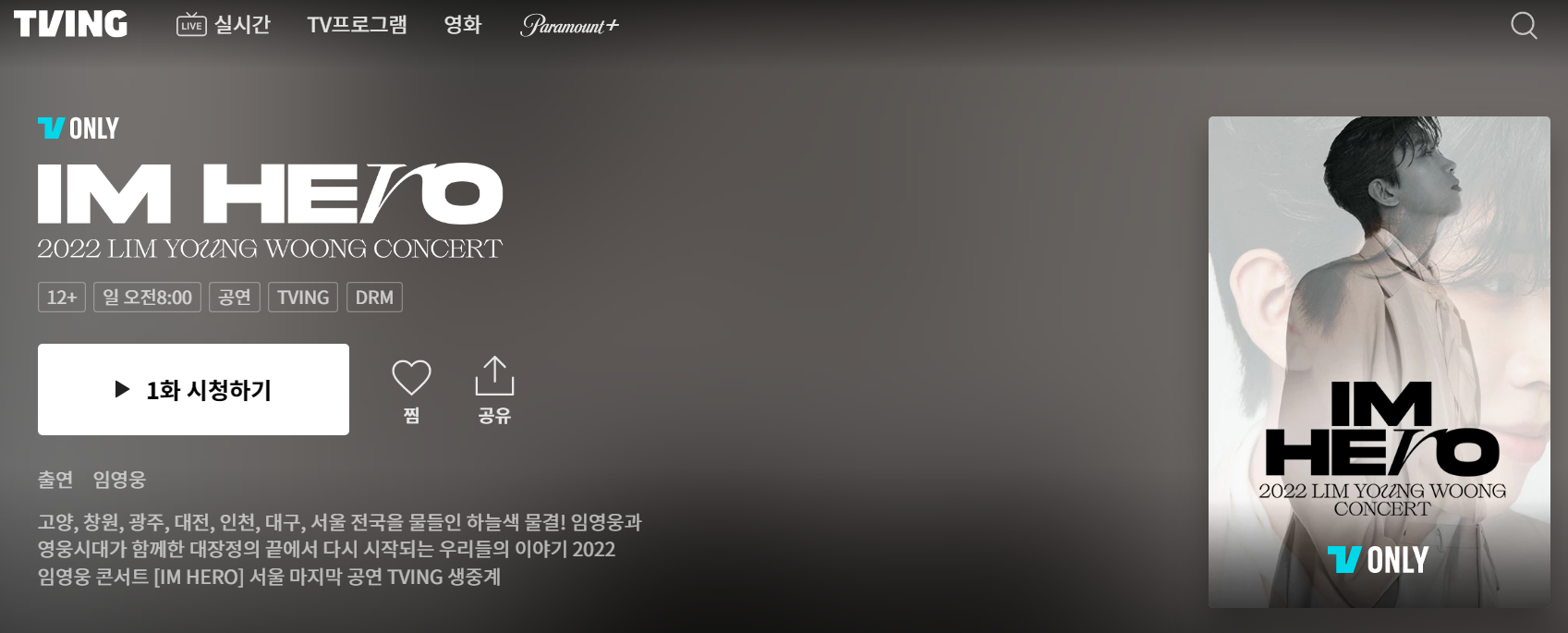 티빙에 가입하시면 임영웅 콘서트 영상은 물론 국내 드라마 예능 프로 및 해외 드라마는 물론 개별 구매를 제외한 영화들도 시청 가능하답니다.