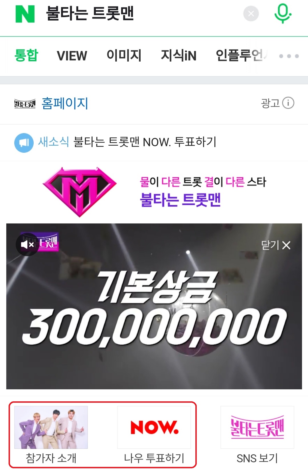 2. 불타는 트롯맨 프로그램 소개 하단에 있는 "참가자 소개" 또는 "나우 투표하기"를 클릭합니다.