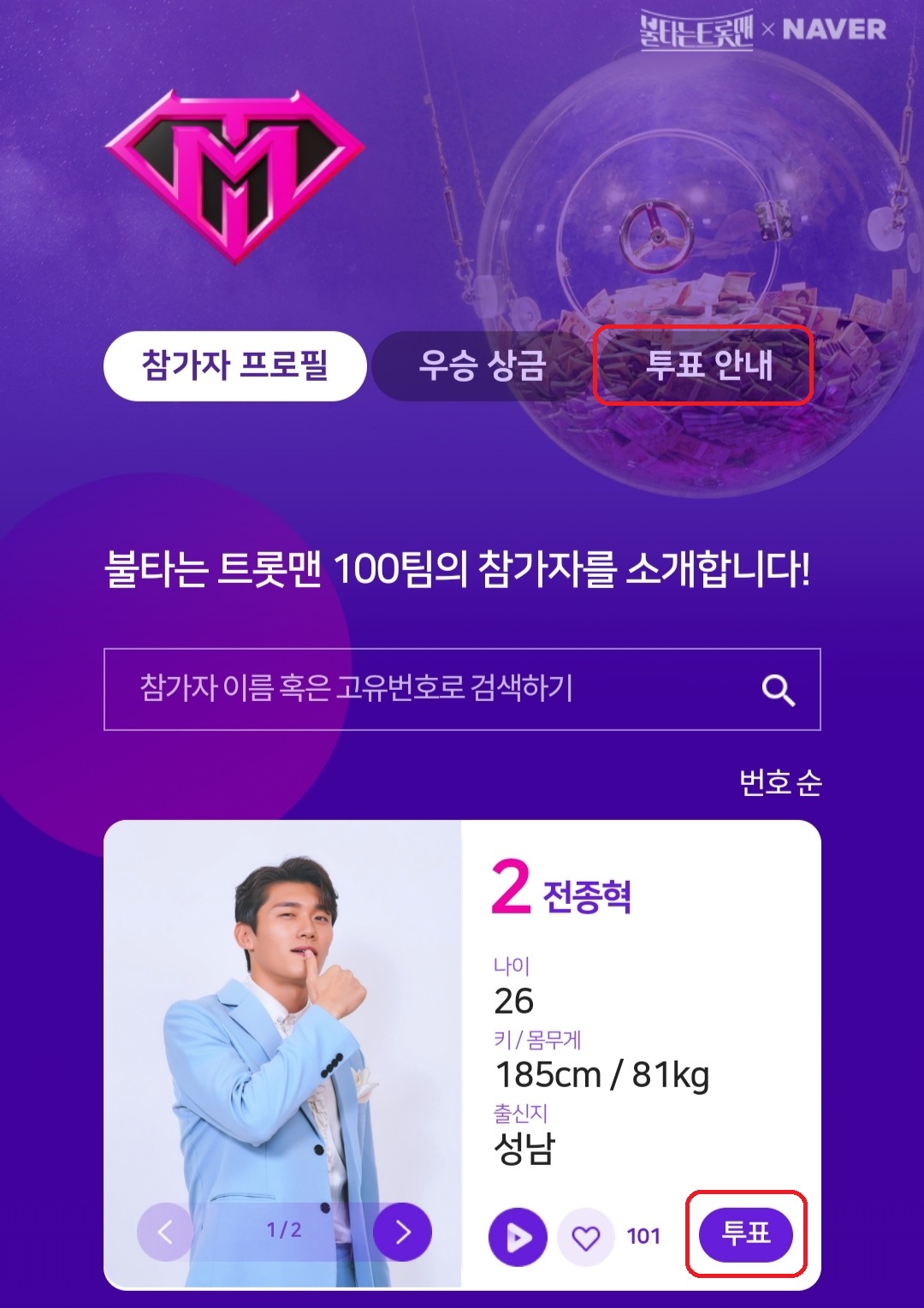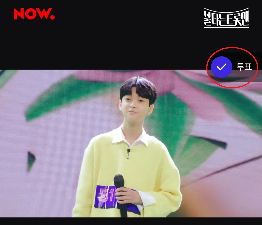 4. 또는 참가자 소개 페이지에서 상단의 "투표 안내" 항목을 클릭한 다음 이동하여 다시 하단의 "투표하기" 버튼을 클릭하셔도 됩니다. (*여기까지는 나우 앱을 통한 불타는 트롯맨 투표방법입니다)