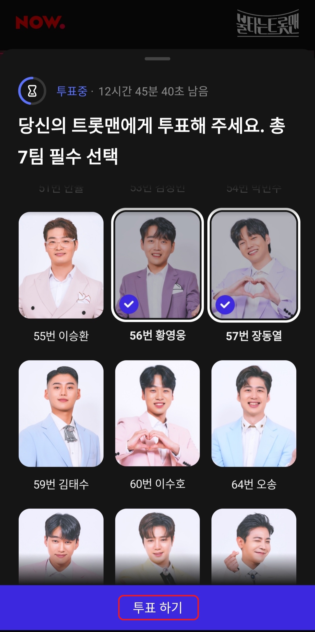 7. 총 45팀의 불타는 트롯맨 본선 진출자들 중 여러분의 마음에 들어온 참가자 7명(팀)을 클릭 후 하단의 "투표하기" 버튼을 클릭합니다.