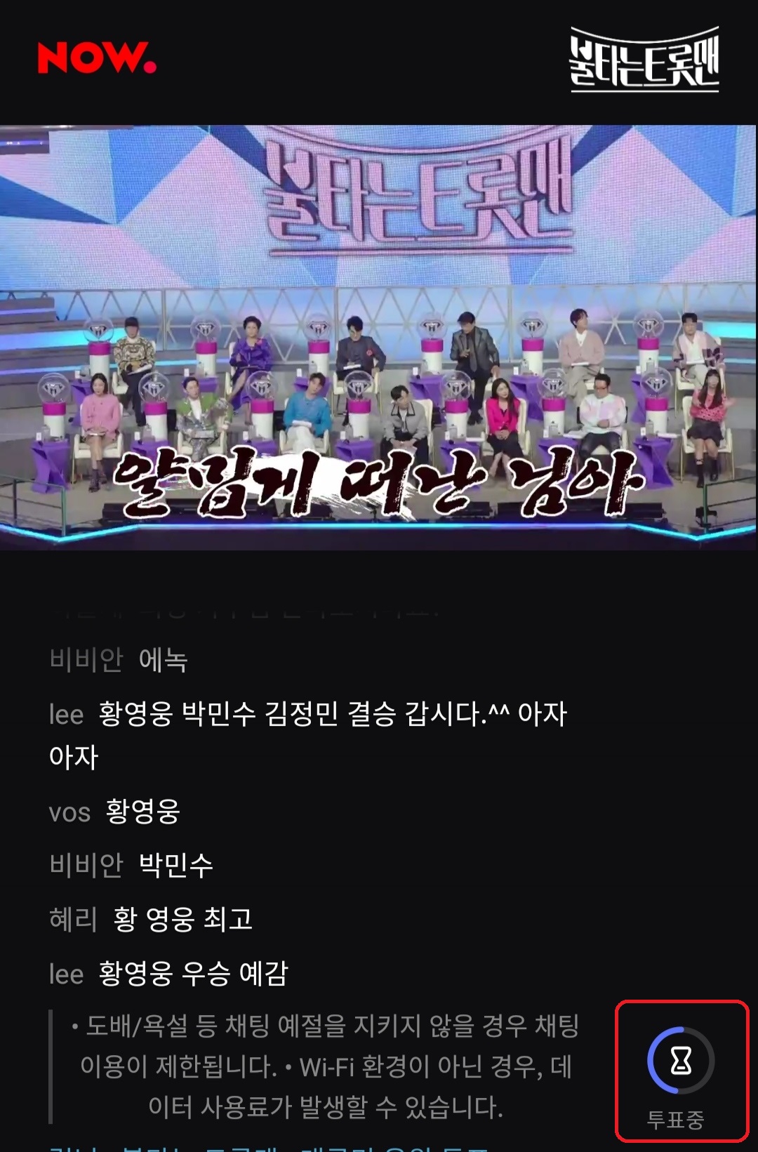 6. 불타는 트롯맨 투표를 진행하기 위해서는 위 처럼 우측 중간쯤에 "투표중"이라는 모래시계 버튼이 보여야 합니다. 이 버튼이 보이신다면 클릭해주세요.