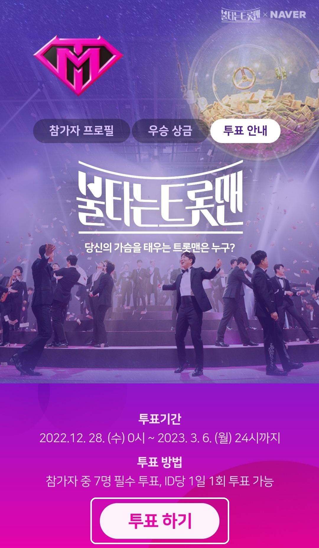 불타는 트롯맨 투표 기간은 2022년 12월 28일 0시부터 2023년 3월 6일 월요일 24시까지이며, ID당 1일 1회 투표하실 수 있습니다.